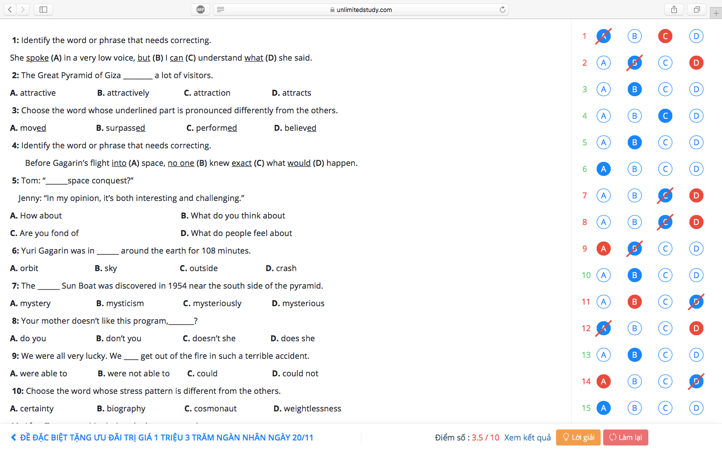 Trang kết quả sau khi làm bài
